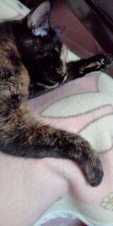 私の膝の上で寝てる。